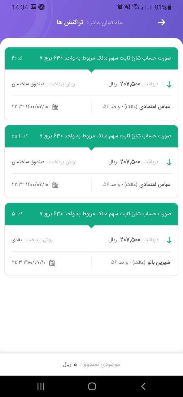 ساکنین در هر لحظه از شبانه روز به صورت آنلاین می توانند وضعیت مالی تراکنش های خود و همچنین وضعیت مالی موجودی صندوق ساختمان را مشاهده کنند. این قابلیت باعث افزایش رضایتمندی و حسن اعتماد به مدیر ساختمان می شود.